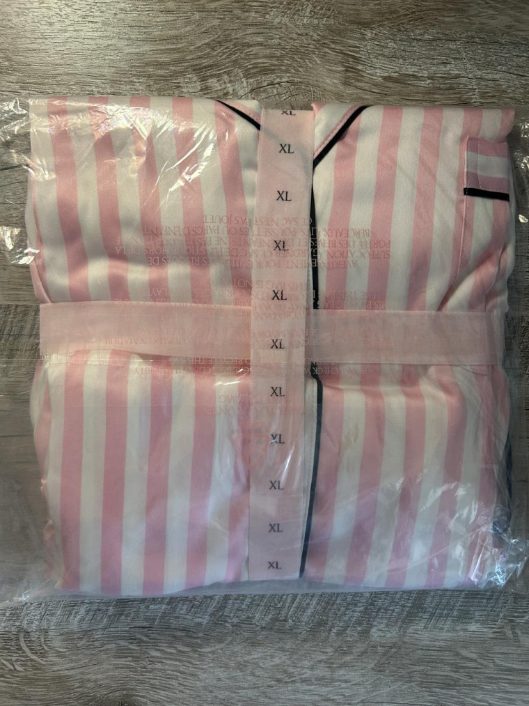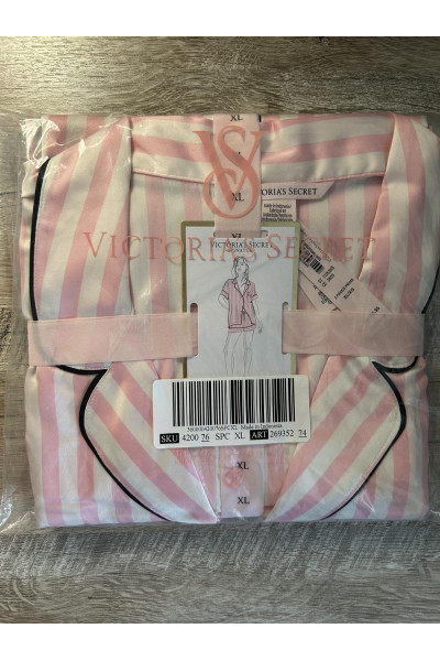 Получите полные восемь часов (или больше) прекрасного сна в блестящем пижамном комплекте Виктория Сикрет из топа с короткими рукавами на пуговицах и подходящими шортами. Цвет пижамы: розовая в полоску с окантовкой.