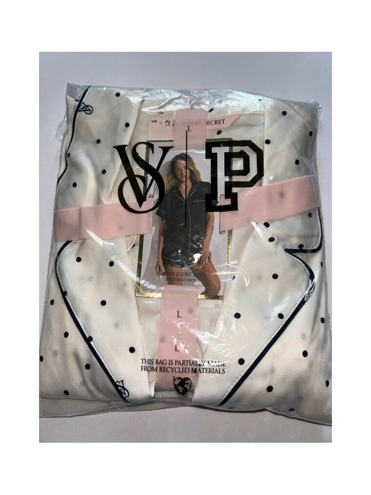 Наслаждайтесь прекрасным сном в этом глянцевом пижамном комплекте Виктория Сикрет, состоящем из рубашки на пуговицах с короткими рукавами и шорт в тон. Цвет пижамы: белая в горошек.