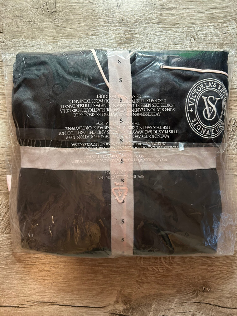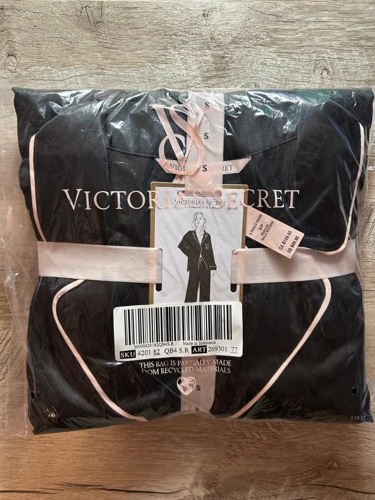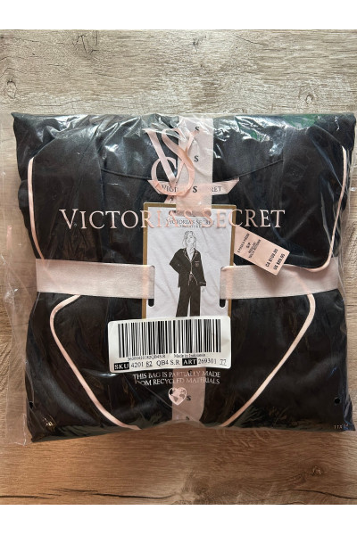 Расслабьтесь в этих атласных брюках и топе от Виктория Сикрет с длинными рукавами, нагрудным карманом, воротником с вырезом и декоративной окантовкой. Цвет пижамы: черная глянцевая.