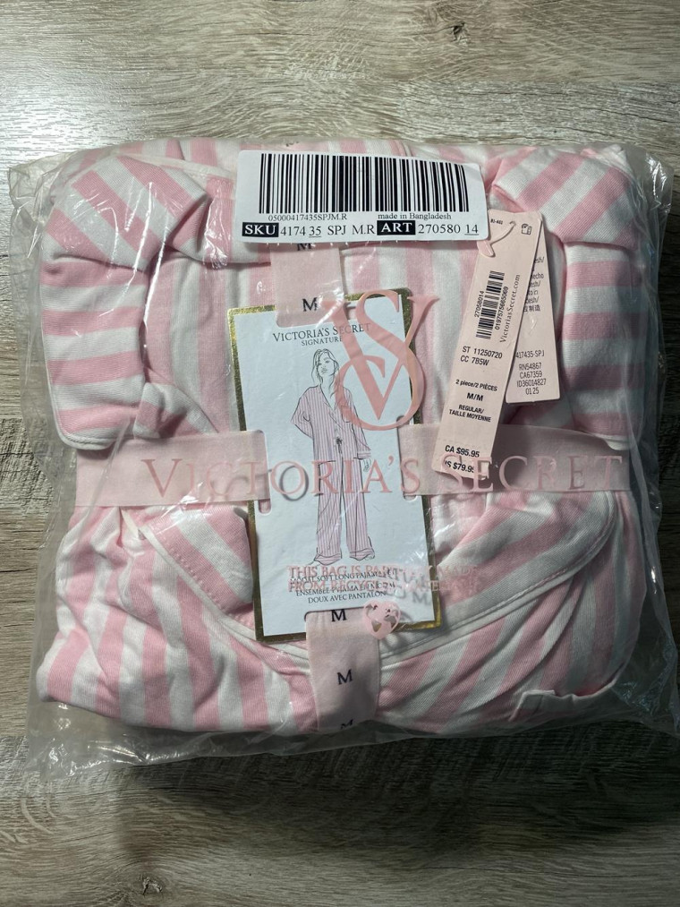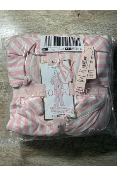 Этот удобный пижамный комплект Виктория Сикрет состоит из топа и простых брюк с кулиской из фирменного модала, маслянистого на ощупь и растягивающегося в четырех направлениях. Цвет пижамы: розовая в полоску.