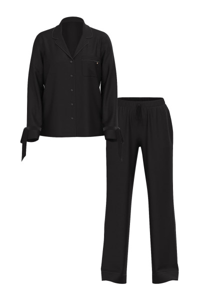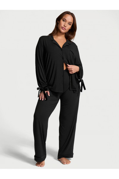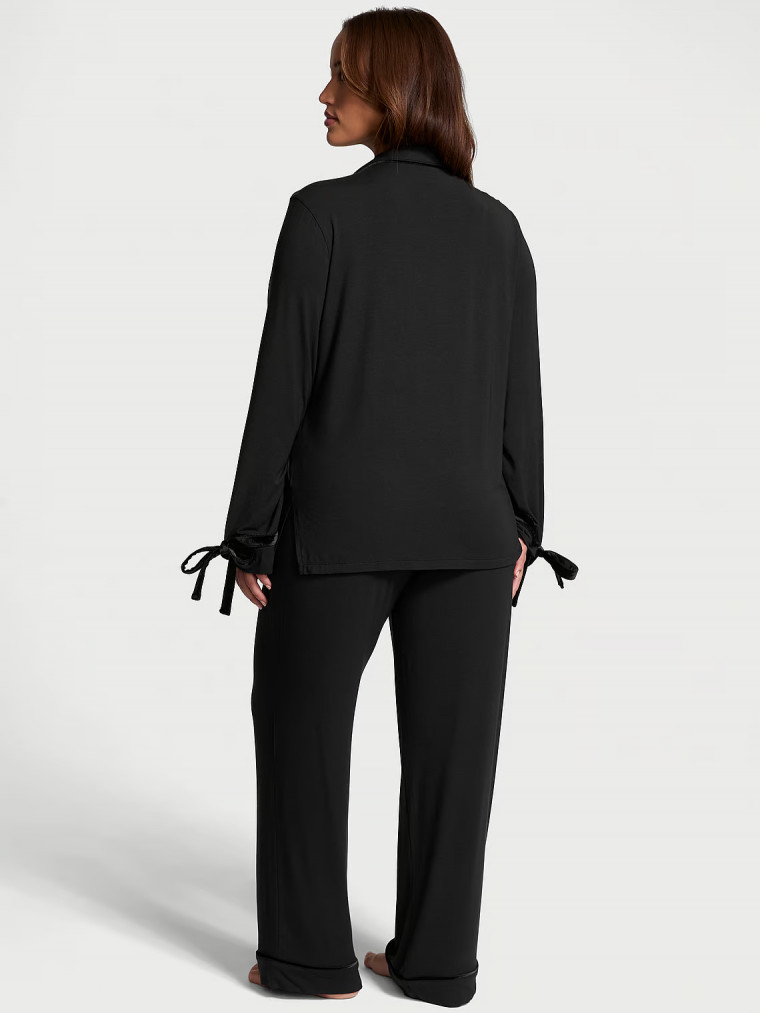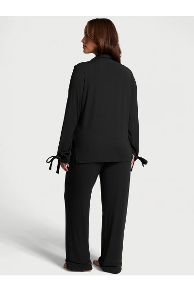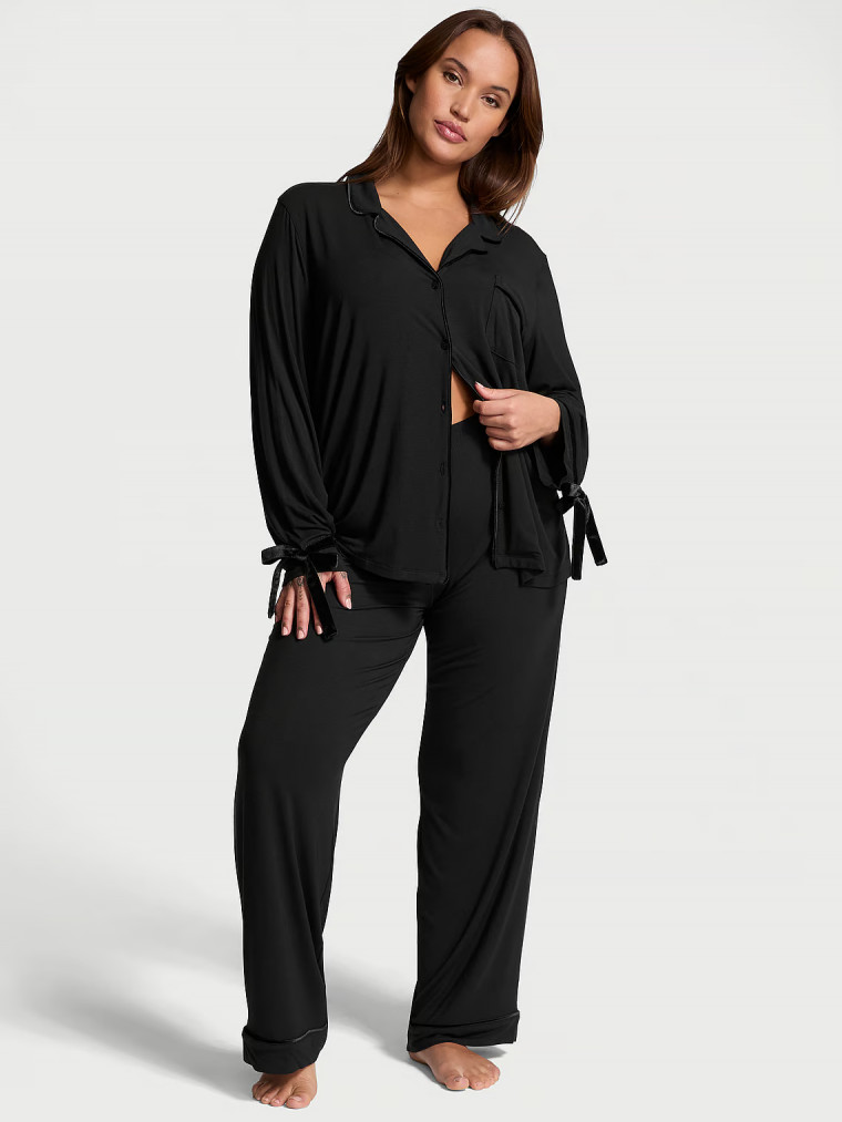 Этот удобный пижамный комплект Виктория Сикрет состоит из топа и брюк на шнурке из фирменного модала, маслянистого на ощупь и растягивающегося в четырех направлениях. Цвет пижамы: черная.