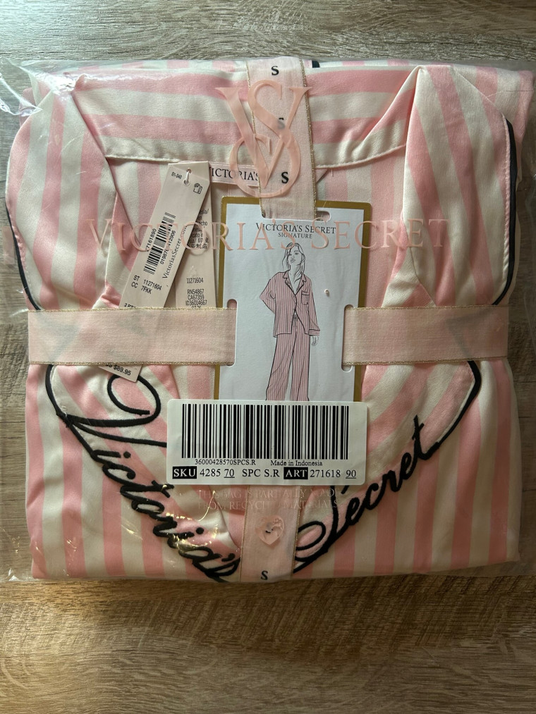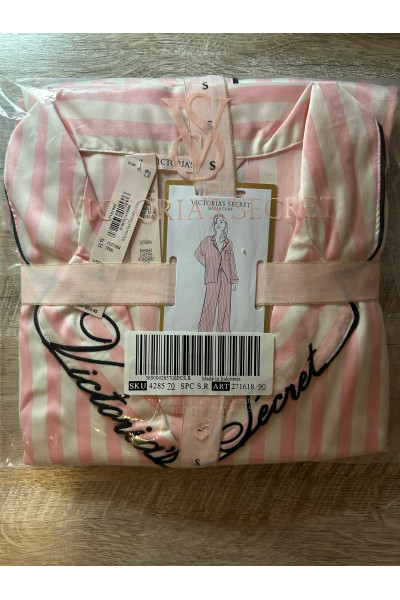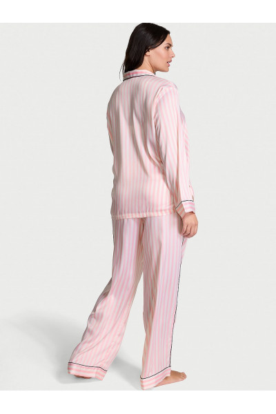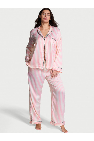 Пижама с вышитым логотипом на воротнике Victoria's Secret Glazed Satin Long Pajama Set. Легендарная розовая полоска в свежем исполнении!