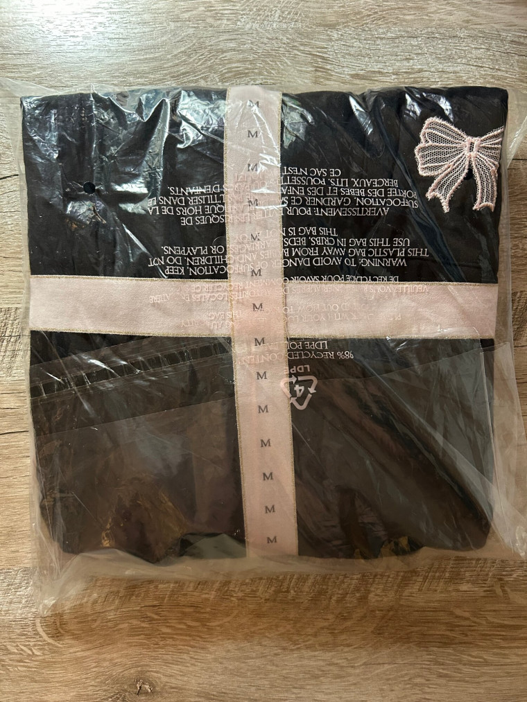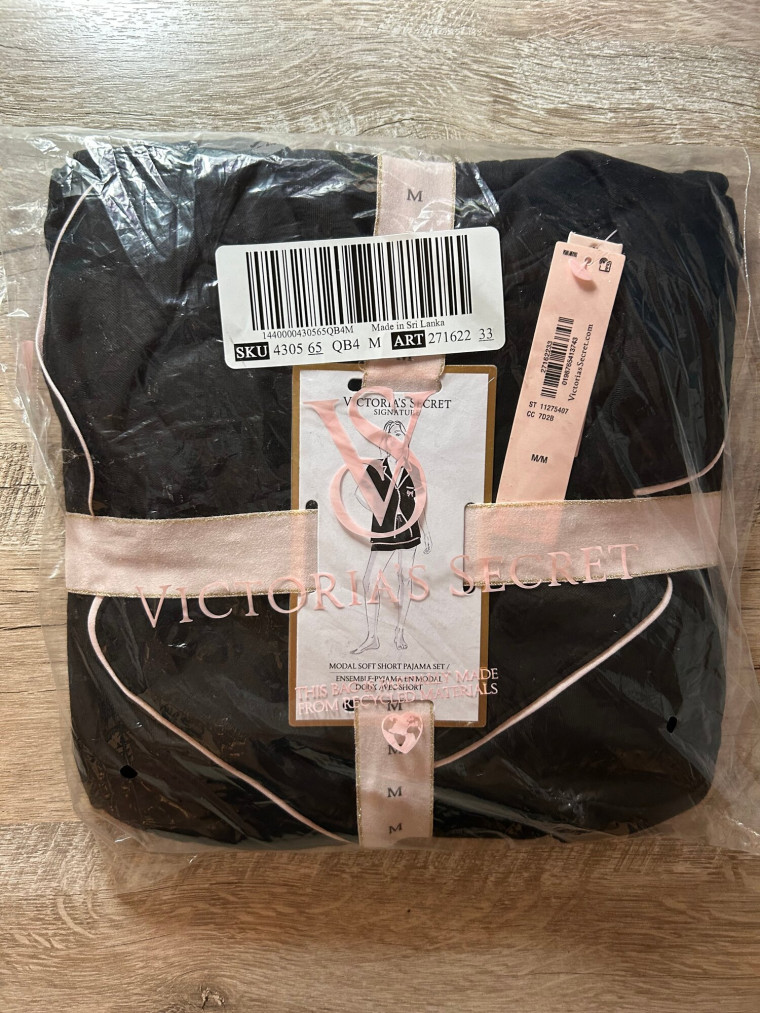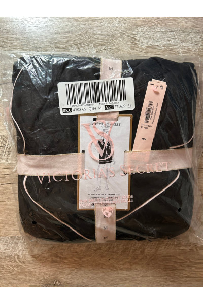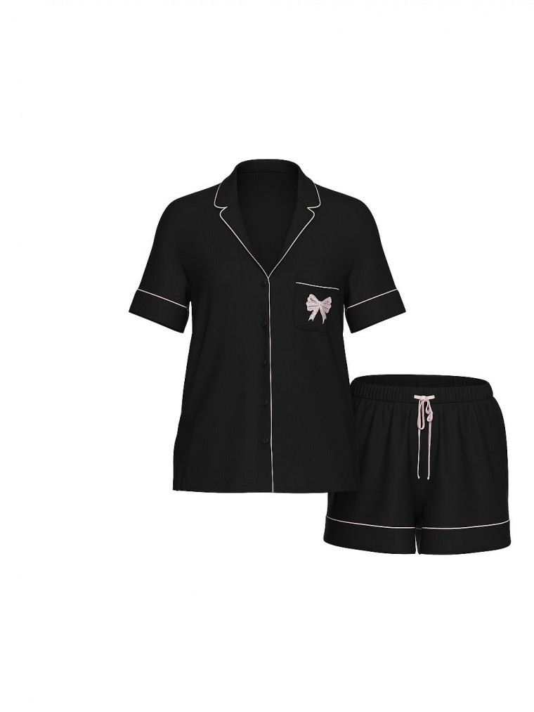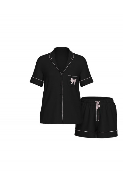 Ваш любимый пижамный комплект из модала? Мы украшаем его бантом. Эти пижамы от Виктория Сикрет не только мягкие, но и облегающие и невероятно лёгкие, обеспечивающие комфорт в любое время года. Украшены кружевным бантом на кармане. Цвет пижамы: черная, с окантовкой и бантиком.